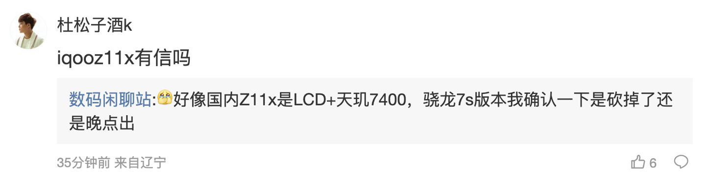 后续有用户在评论区询问:“iqooz11x 有信吗”,博主回复道:“好像国内 Z11x 是 LCD+ 天玑 7400,骁龙 7s 版本我确认一下是砍掉了还是晚点出”;另一名用户则询问道:“年底旗舰电池有没有 9 开头的”,博主回复道:“子系有”。