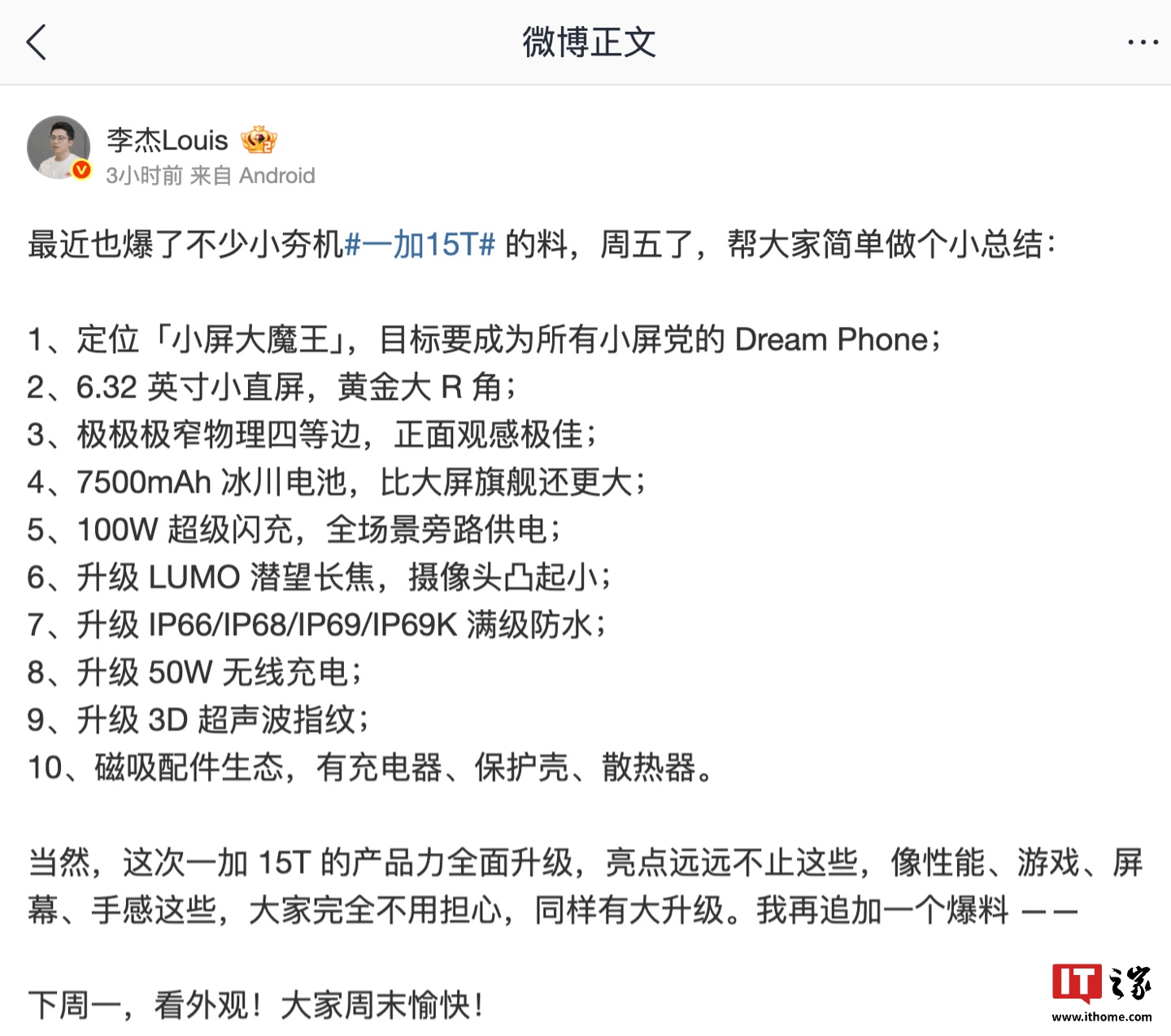 IT之家 3 月 6 日消息,一加中国区总裁李杰今天发布微博,对一加 15T 手机最近的爆料作出总结。