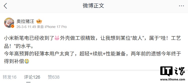 IT之家 3 月 6 日消息,笔吧评测室 @奥拉猪汪 今日表示他已经收到了小米尚未发布的新一代超轻笔记本电脑新品,网友猜测可能会采用 Xiaomi Book Air 之类的命名。