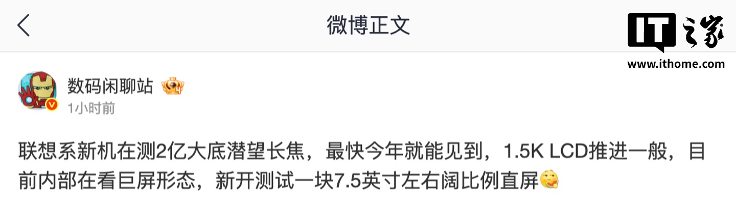 博主透露,该品牌的 1.5K LCD 屏幕推进一般,目前内部在看“巨屏形态”,新开测试一块 7.5 英寸左右阔比例直屏。