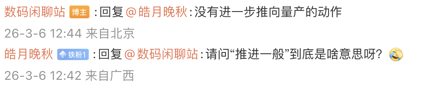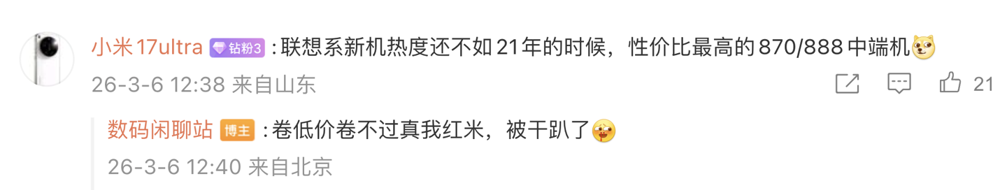 后续有用户在评论区表示:“联想系新机热度还不如 21 年的时候,性价比最高的 870/888 中端机”,博主回复道:“卷低价卷不过真我红米,被干趴了”;另一名用户则询问道:“请问‘推进一般’到底是啥意思呀?”,博主则回复道:“没有进一步推向量产的动作”。