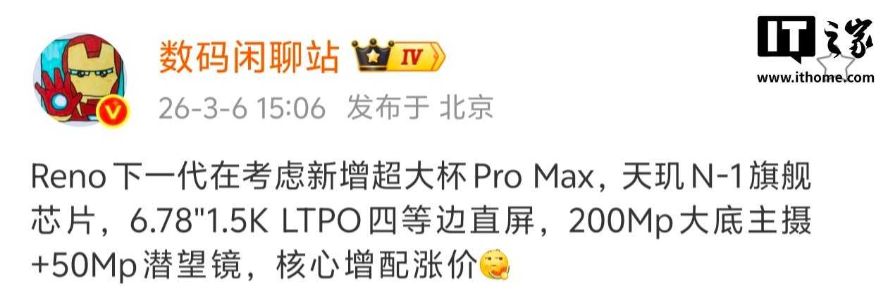IT之家 3 月 6 日消息,据博主 @数码闲聊站 今日爆料,OPPO Reno 下一代在考虑新增超大杯 Pro Max,新机搭载天玑 N-1 旗舰芯片、6.78"1.5K LTPO 四等边直屏、200Mp 大底主摄 +50Mp 潜望镜,核心增配涨价。