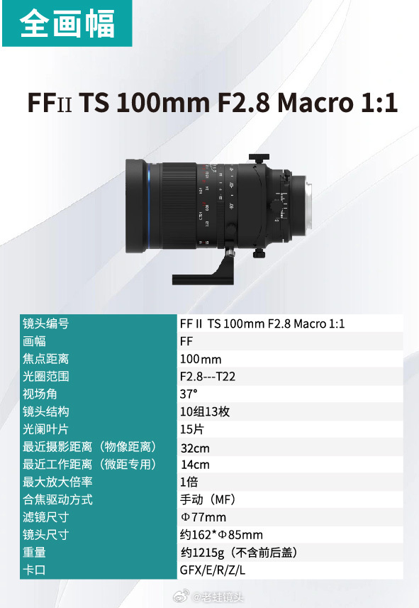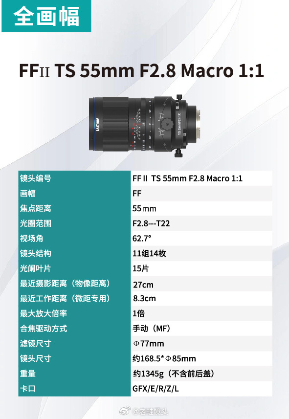 作为参考,老蛙在北京 P&E 展会中公开展示了两款移轴镜头“FFII TS 100mm F2.8 Macro 1:1”及“FFII TS 55mm F2.8 Macro 1:1”。这两款镜头均支持平移、摇头,360 度旋转支架,提供 E / R / Z / L 卡口,虽然是全画幅镜头,但官方也推出了富士 GFX 卡口版本,号称可以拍出“小人国”视角。
