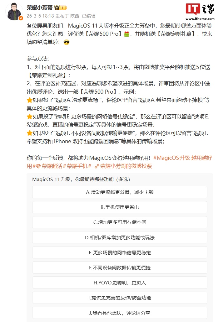 IT之家 3 月 6 日消息,荣耀产品维护与升级 @荣耀小芳哥 今日宣布,MagicOS 11 系统大版本“正全力筹备中”。