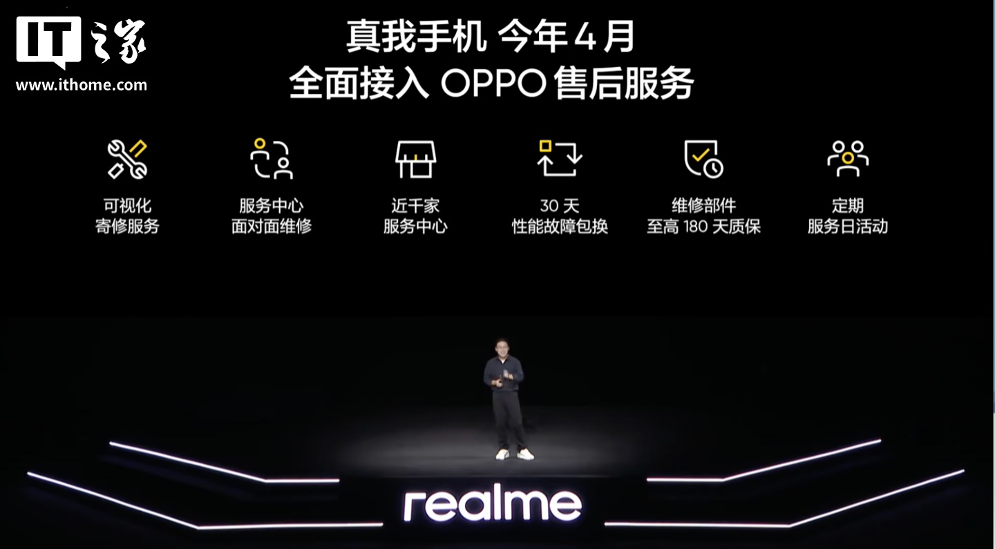 同样是今年 1 月,在真我 realme Neo8 手机发布会中,真我 realme 副总裁、全球营销总裁、中国区总裁徐起宣布,真我手机将于今年 4 月全面接入 OPPO 售后服务。