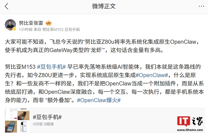 中兴通讯副总裁、努比亚旗舰产品总经理张雷发文补充了 Z80 Ultra 系统化集成原生 OpenClaw 的相关信息: