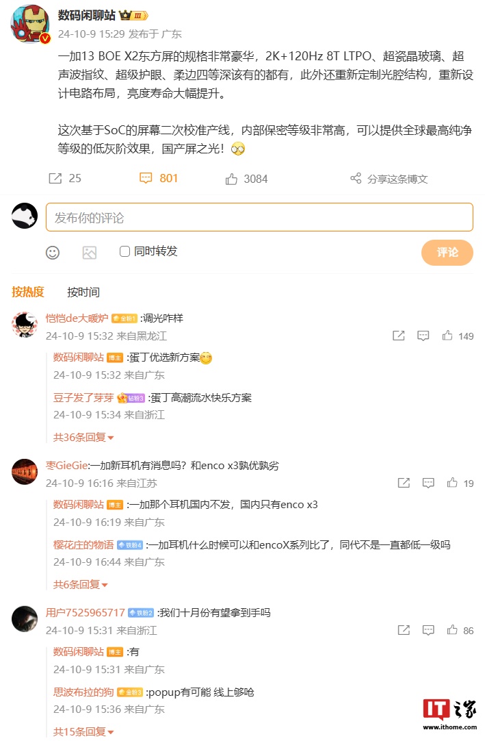 博主还在评论区中回复了部分网友问题:关于一加新耳机发布情况,博主称“一加那个耳机国内不发,国内只有 Enco X3”;关于新机“十月份有望拿到手吗”,博主称“有”。