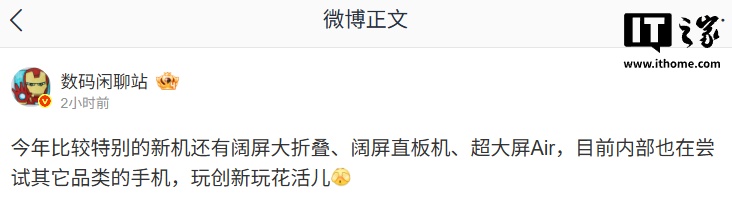 IT之家 3 月 7 日消息,博主 @数码闲聊站 今日爆料,某厂今年比较特别的新机还有阔屏大折叠、阔屏直板机、超大屏 Air,目前内部也在尝试其它品类的手机。结合该博主的爆料习惯,评论区网友推测为华为品牌。