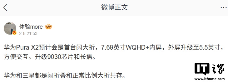 另有博主 @体验more 爆料,华为 Pura X2 预计会是首台阔大折:7.69 英寸 WQHD+ 内屏、外屏升级至 5.5 英寸,方便交互。另外,该机还会升级麒麟 9030 芯片和长焦。