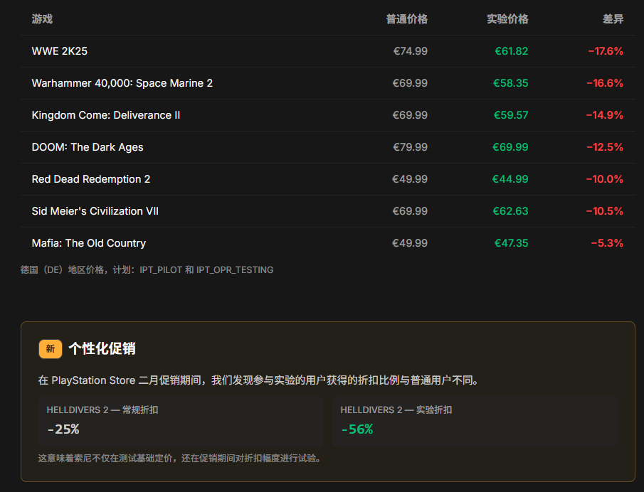价格差异方面,根据 PSPrices 的数据,不同用户看到的折扣幅度从 5.3% 到 17.6% 不等。例如,标准售价 69.99 欧元的《宇宙机器人》部分用户看到的价格为 61.16 欧元,折扣 12.6%;而《战锤 40K:星际战士 2》的差价更为明显,部分用户可享受高达 16.6% 的折扣;最高的《WWE 2525》甚至达到了 17.6% 的差异。