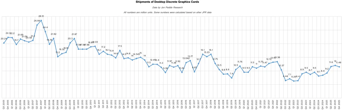 由于 GPU 供应受限、GDDR 显存价格高企以及地缘政治不确定因素增加,Jon Peddie Research 预计 2026 年台式机显卡市场将同比下降 10%。