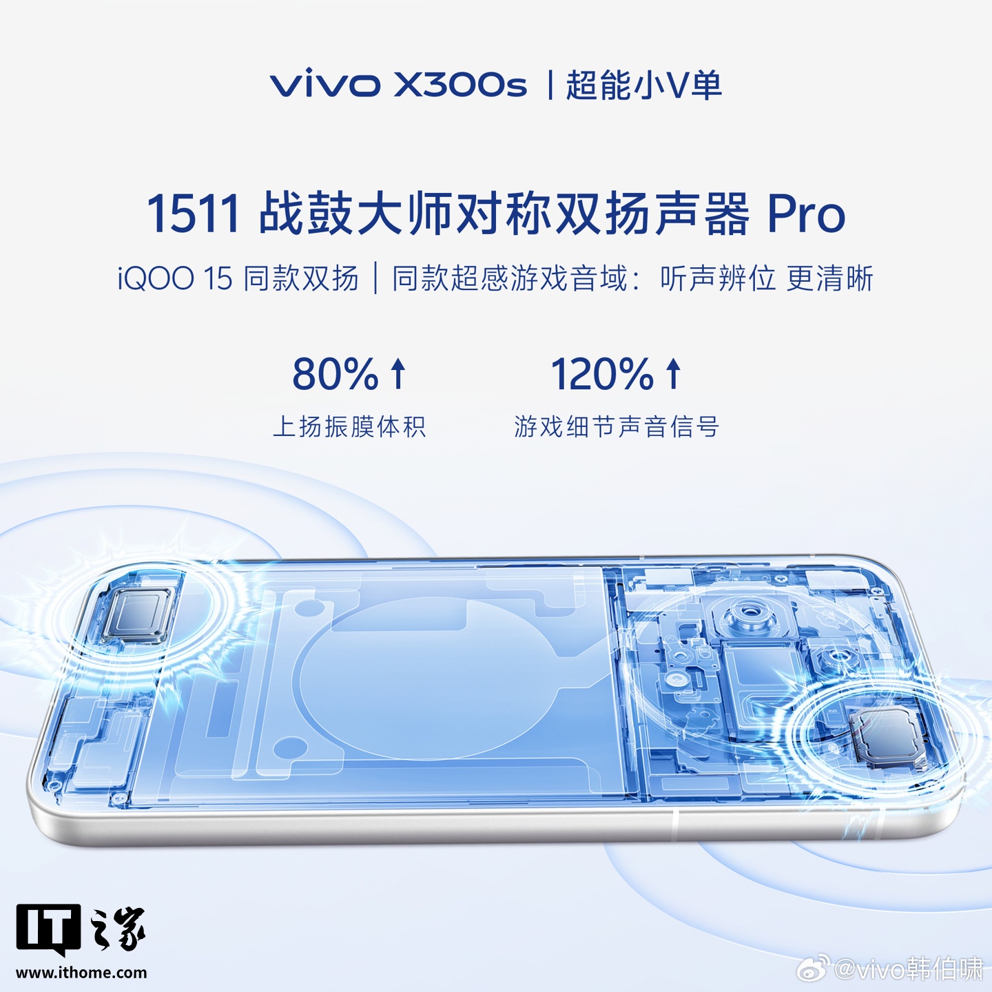 2. 1511 战鼓大师对称双扬声器 Pro,iQOO 15 同款对称双扬,还升级新一代功放和算法,上下均是 1511,超大尺寸,超宽声场。同时配备 iQOO 15 同款超感游戏音域,游戏细节声音信号直接提升 120%,听声辨位能力大幅增强,脚步声 / 枪声更显著。