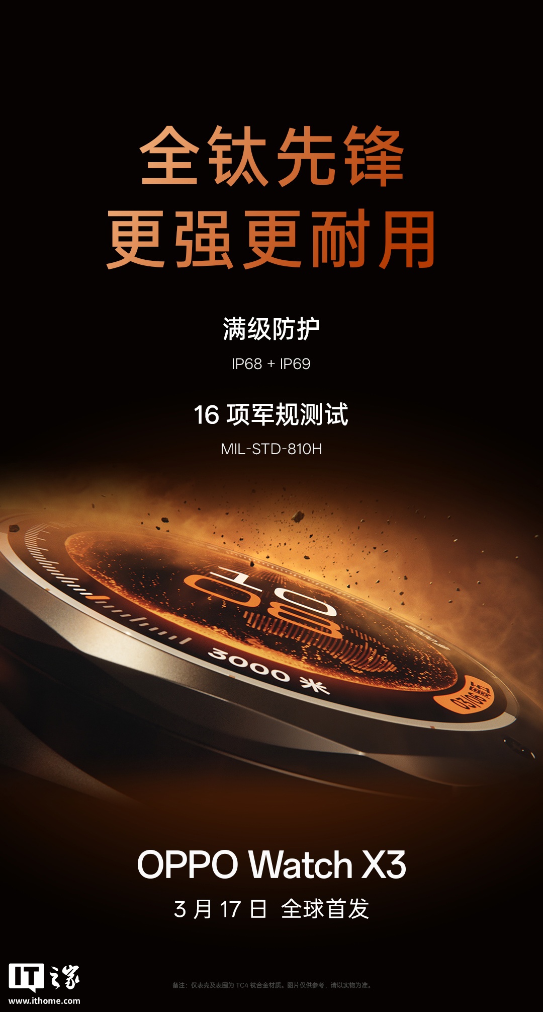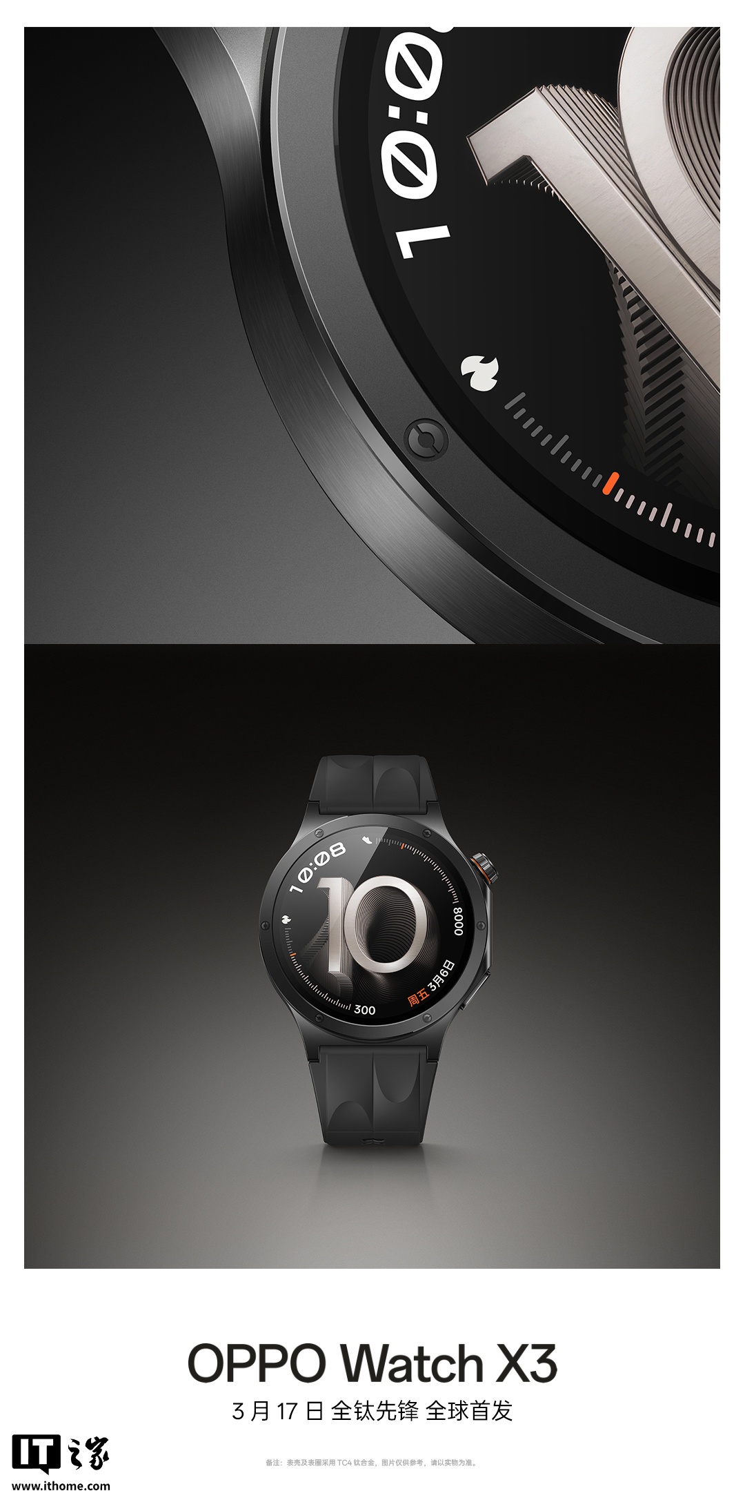 IT之家从 OPPO 官方获悉,OPPO Watch X3 提供寰宇星橙、无限钛、引力黑三种配色,将在 3 月 17 日 19:00,与 OPPO Find N6 折叠屏手机一同发布。