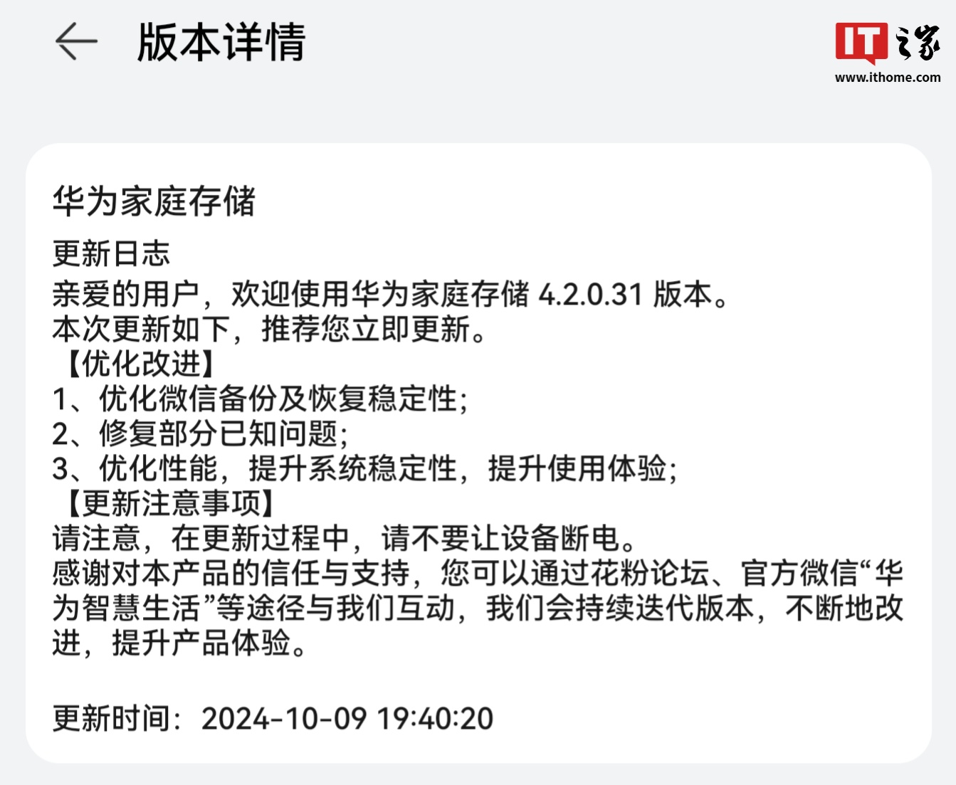 IT之家 10 月 9 日消息,华为家庭存储现获推鸿蒙 HarmonyOS 4.2.0.31 版本升级,新版本主要优化了微信备份及恢复稳定性。更新详情如下:
