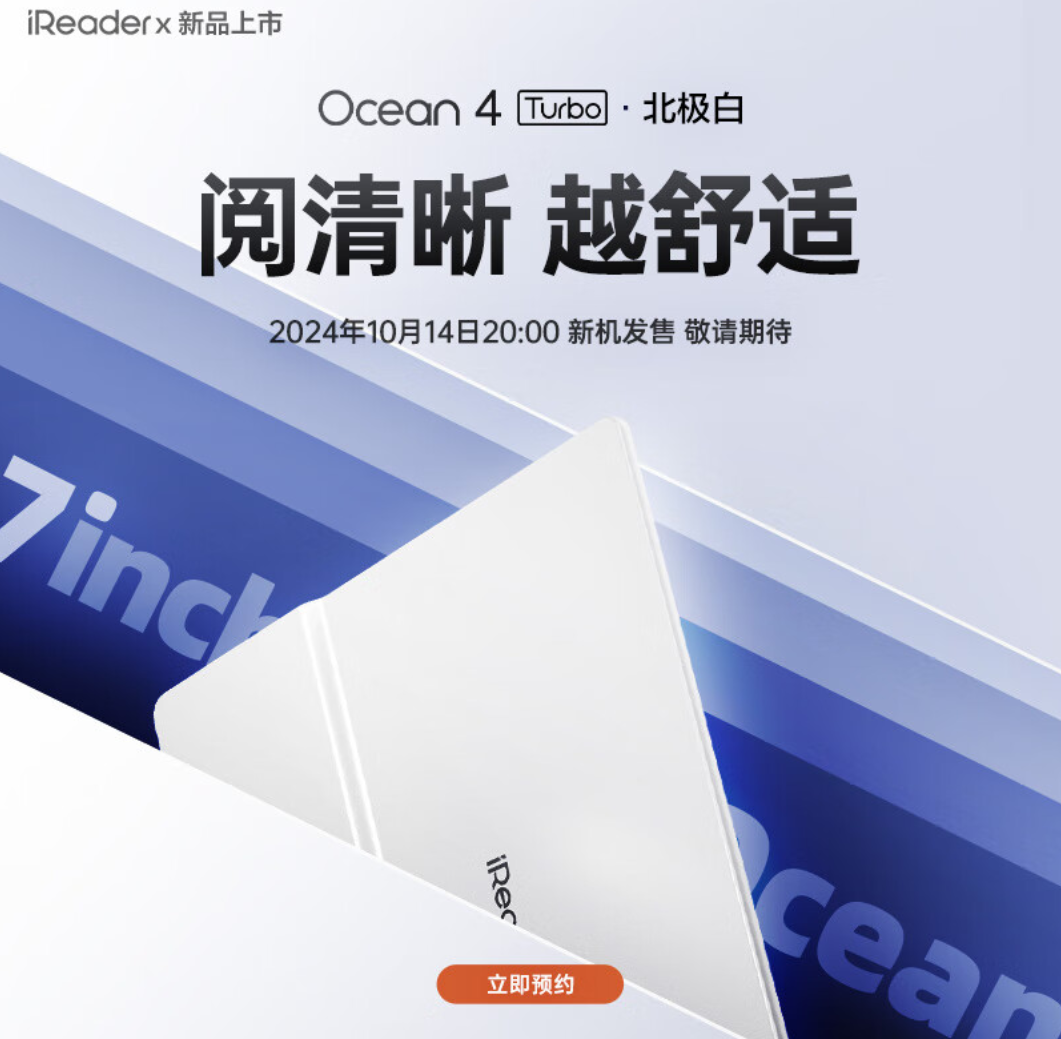 IT之家 10 月 9 日消息,掌阅 iReader Ocean 4 Turbo 墨水屏电纸书“北极白”现上架京东开启预约,该款电纸书将于 10 月 14 日 20:00 发售。