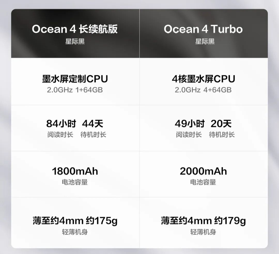 据IT之家此前报道,iReader Ocean 4 Turbo 发布于今年 7 月,搭载 2.0Ghz “四核”处理器,拥有 4GB RAM + 64GB 存储空间,续航约 49 小时阅读时长或 20 天待机时长,售价 1599 元。