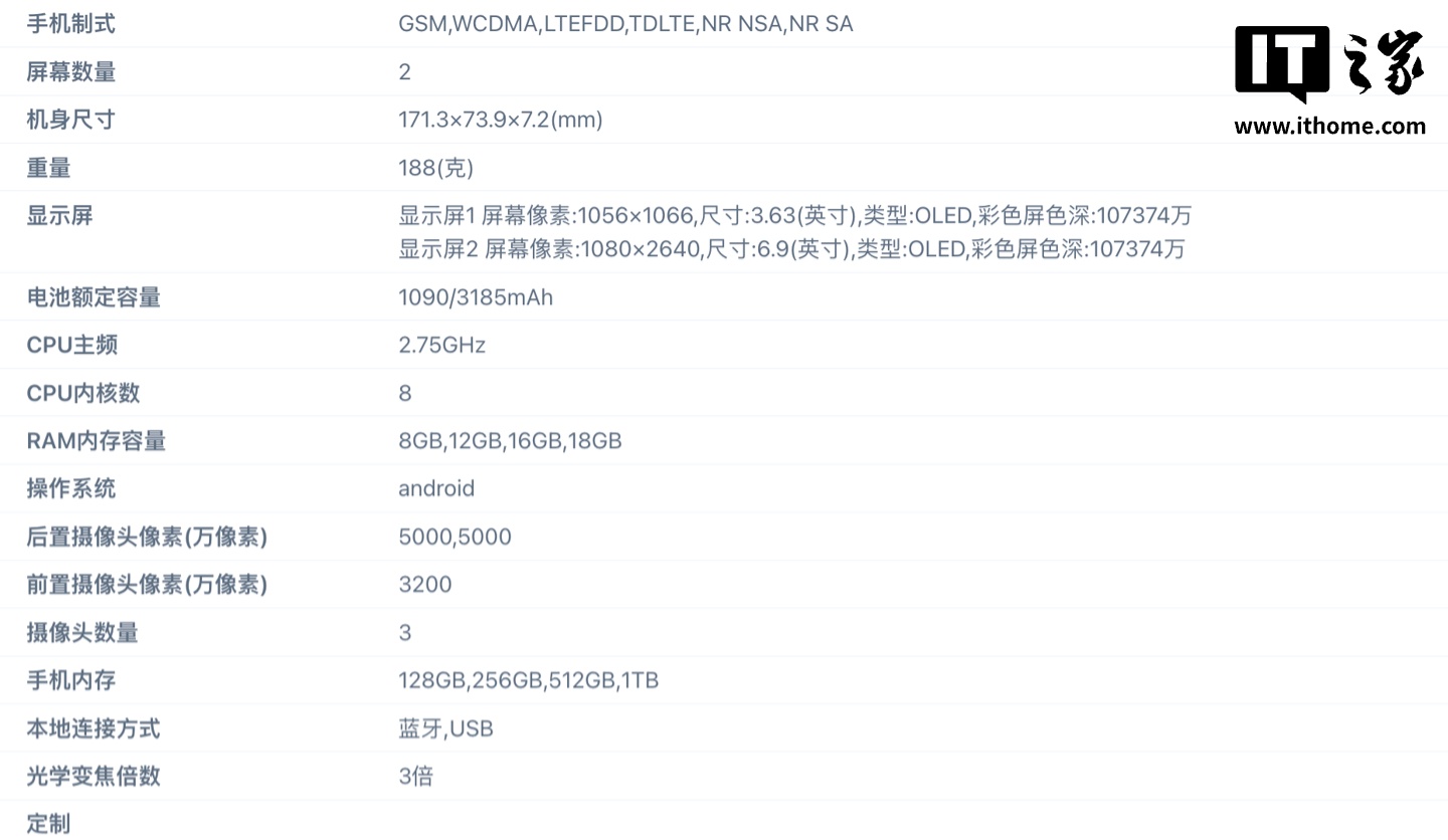 该机将搭载 32MP 自拍摄像头;手机背面匹配 50MP 主摄和 13MP 超广角,手机内置 2.75GHz 八核处理器,其中入门款将提供 8GB RAM + 128GB 存储空间,至高有望提供 18GB RAM + 1TB 存储空间组合。