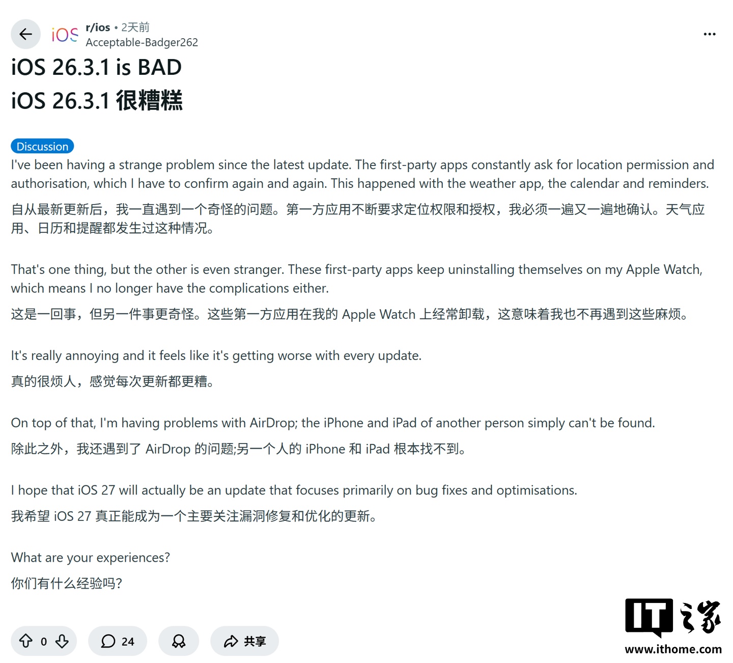 网友 u/Acceptable-Badger262 反馈,升级后包括天气、日历和提醒在内的第一方应用在更新后仍不断要求位置授权。