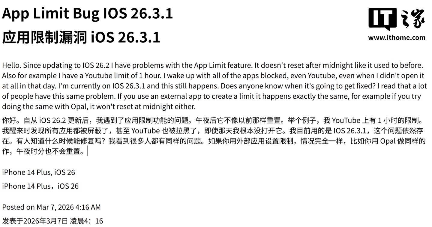 IT之家 3 月 10 日消息,科技媒体 Mac Observer 今天(3 月 10 日)发布博文,基于社区用户反馈,梳理了 iPhone 17 等用户升级 iOS 26.3.1 更新(3 月 5 日发布)后遇到的一些问题。