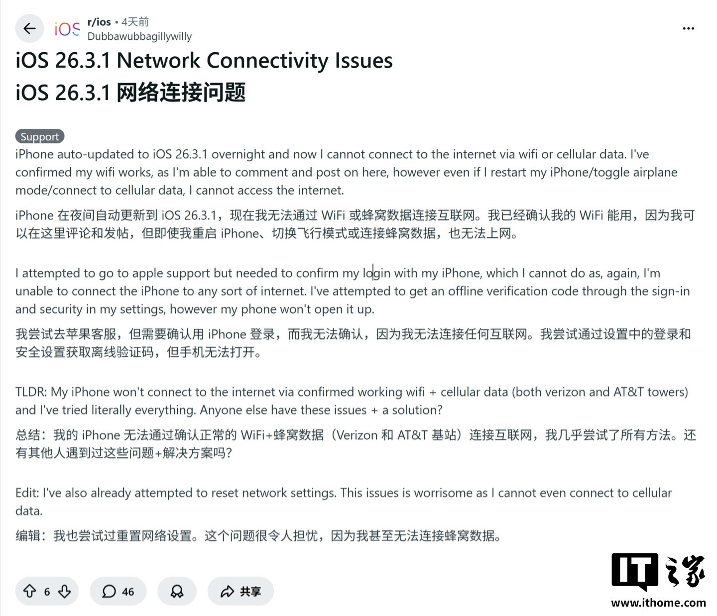 网友 u/Dubbawubbagillywilly 在 Reddit 社区反馈,在夜间安装升级 iOS 26.3.1 更新之后,无法正常通过 Wi-Fi 或者蜂窝数据连接互联网。