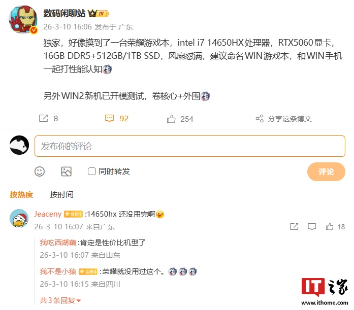 IT之家 3 月 10 日消息,博主 @数码闲聊站 今日发文,称好像摸到了一台荣耀游戏本。该机搭载 Intel i7-14650HX 处理器 + RTX5060 显卡,辅以 16GB DDR5+512GB/1TB SSD,同时风扇怼满。