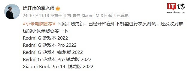 IT之家 10 月 9 日消息,小米笔记本产品经理 @烧开水的李老师 今日在微博表示,小米电脑管家下沉计划更新,已经开始在如下机型进行灰度测试: