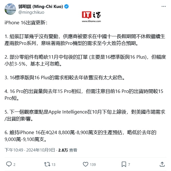 IT之家 10 月 10 日消息,天风证券分析师郭明錤昨日(10 月 9 日)在 X 平台发布推文,分享了关于苹果 iPhone 16 系列机型出货相关信息。