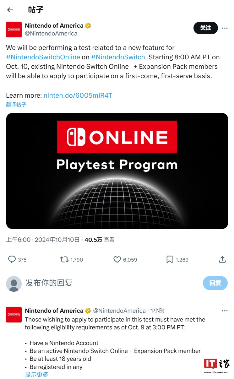 这次测试被简单命名为“ Nintendo Switch Online:测试计划”,将在 10 月 24 日至 11 月 6 日进行。Nintendo Switch Online + 扩展包会员可以从 10 月 10 (今)日开始申请参与。