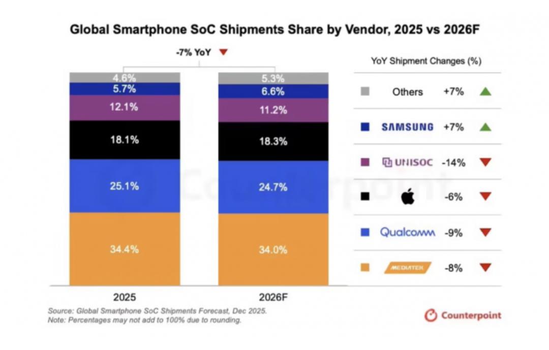上游芯片市场同样给出了信号:Counterpoint预测2026年联发科出货量将同比下滑8%,高通下滑9%,主要服务低端市场的紫光展锐则将下滑14%。