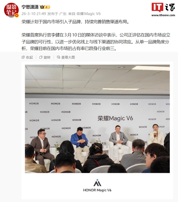 IT之家 3 月 10 日消息,据博主 @宁思潇潇 分享,荣耀 CEO 李健在发布会后接受媒体采访时表示,公司正评估在国内市场设立子品牌的可行性,以进一步优化线上与线下渠道的协同效应。从单一品牌角度分析,荣耀目前在国内市场的占有率已跻身行业前三。