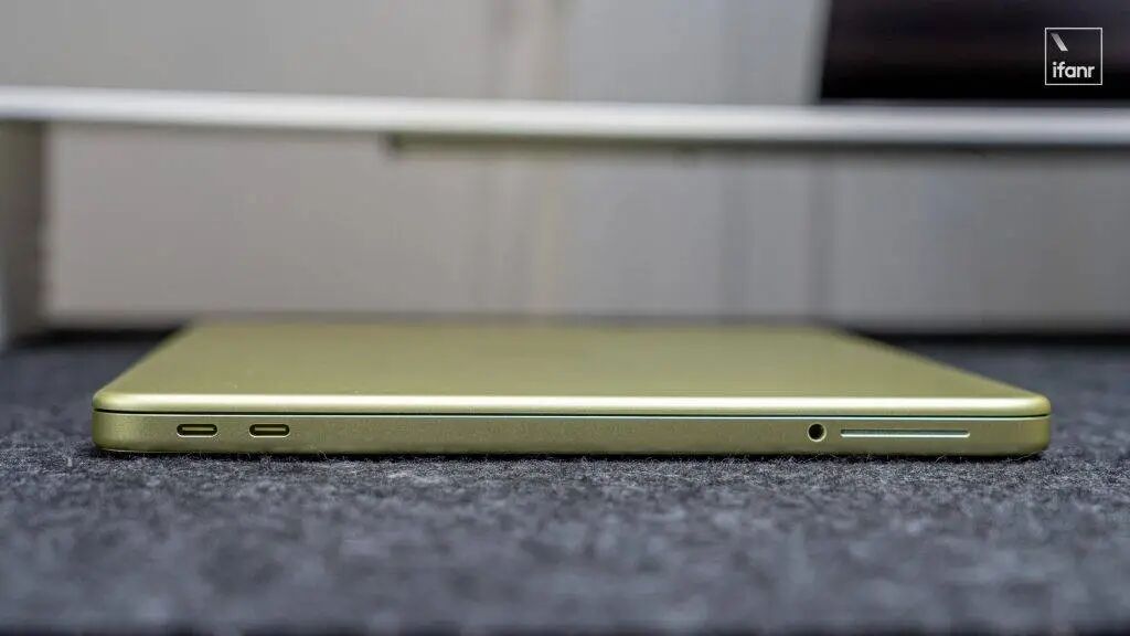 还有一个细节,MacBook Neo A 面的苹果 Logo 并不是 Air 和 Pro 同款的高亮工艺,而是磨砂材质。爱范儿手上这台工差略大,Logo 和机身之间的接缝明显。