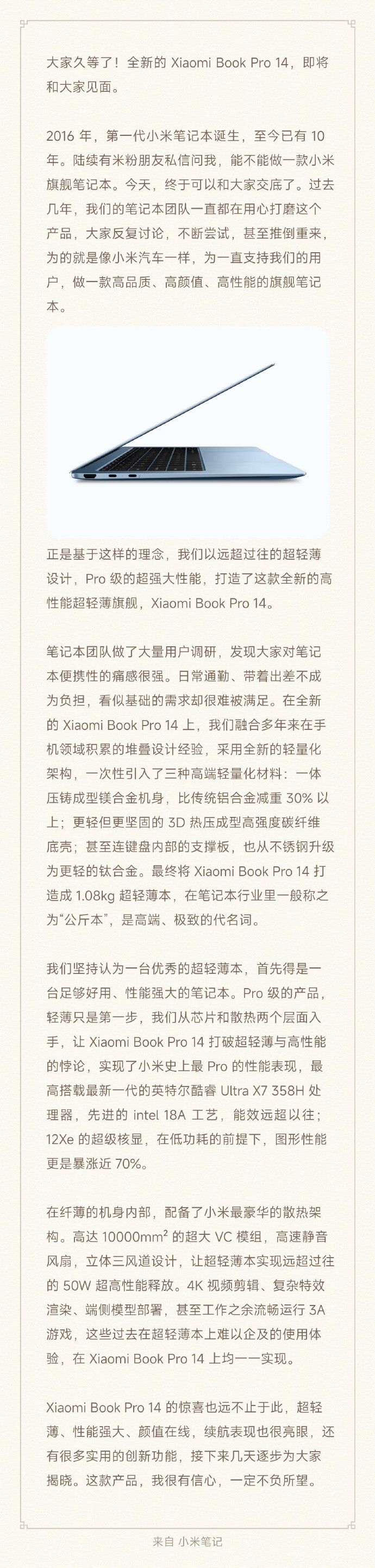IT之家 3 月 12 日消息,全新小米笔记本 Pro 14 今日正式官宣,定位“高性能超轻薄本”,即将发布。小米品牌总经理卢伟冰刚刚发文,对这款新品进行了预热。