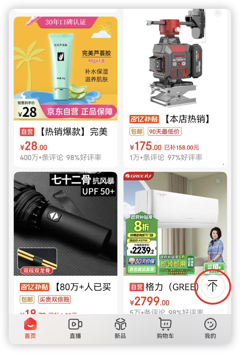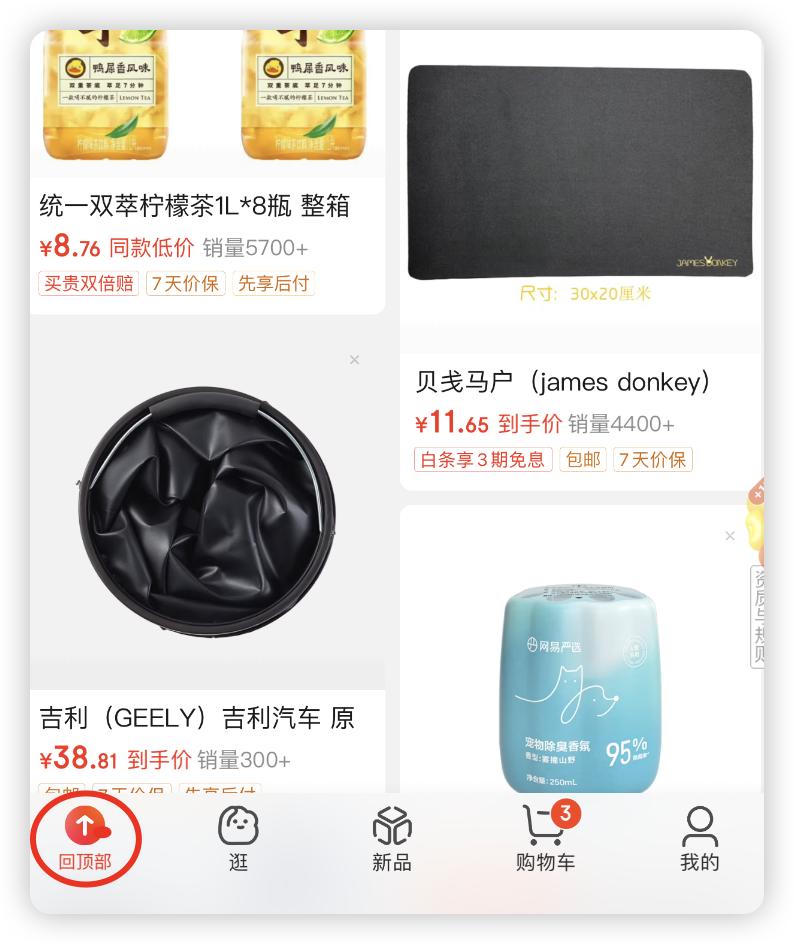 浏览商品时,iOS、安卓都可以通过点击左下角底栏的”首页“按钮返回顶部,而鸿蒙是悬浮在商品内容之上的,存在误触可能,这点上显然 iOS、安卓版的布局更加成熟。