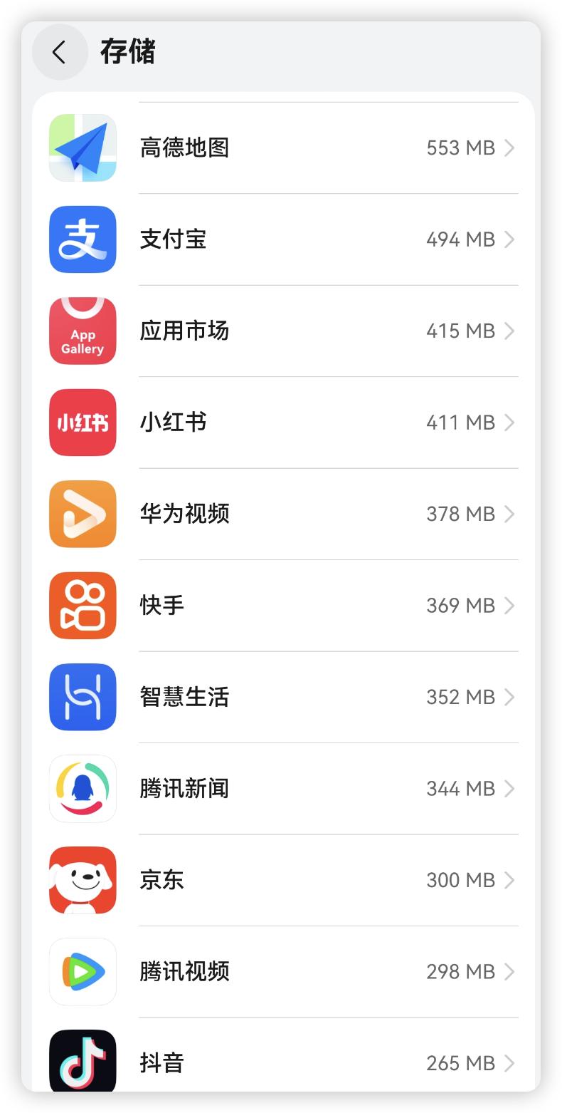 当然,APP 的体积肯定不会止步于刚安装完的新生儿状态,因为当你第一次打开这些 APP,把它们“软生”中珍贵的小红点粗暴夺取时,APP 会在后台展开一系列线程来丰富资源和扩展模块,容量进一步变化。