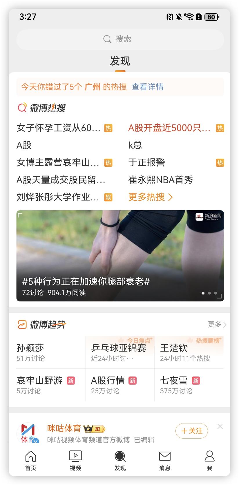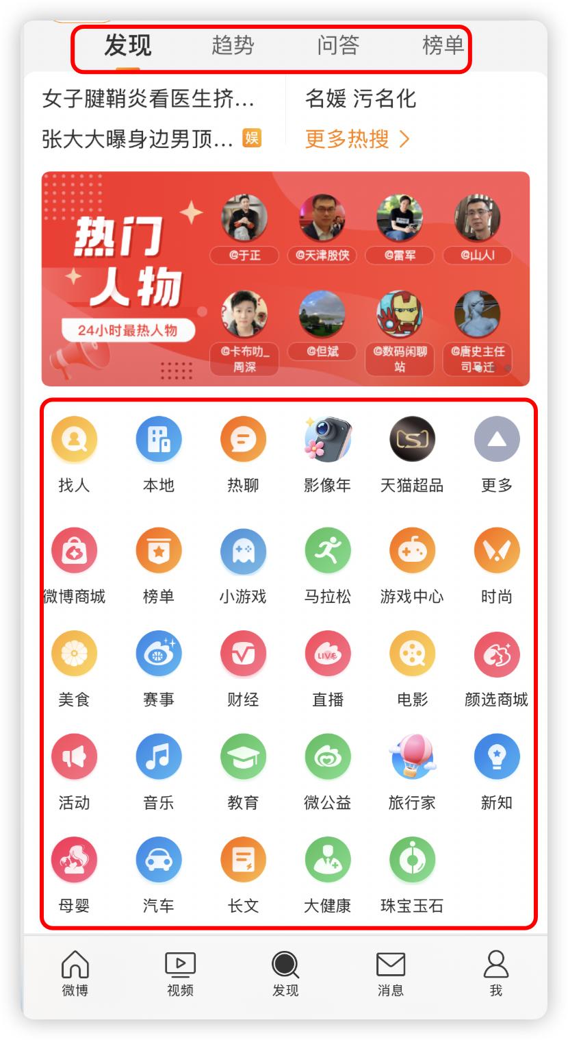 先说微博,布局基本一致,区别明显的是“发现”页面,可以看到 iOS 版微博上方有其他选项,中间的细化分类丰富,鸿蒙版则很简洁。