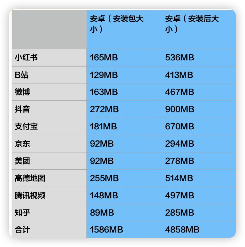 安卓 APP 的合计容量,会从安装好的 4858MB 变为 7691MB,要知道这还只是 10 个APP,按照大多数人常用的 20 个 APP 左右为准,这会可能得接近 20GB 了。