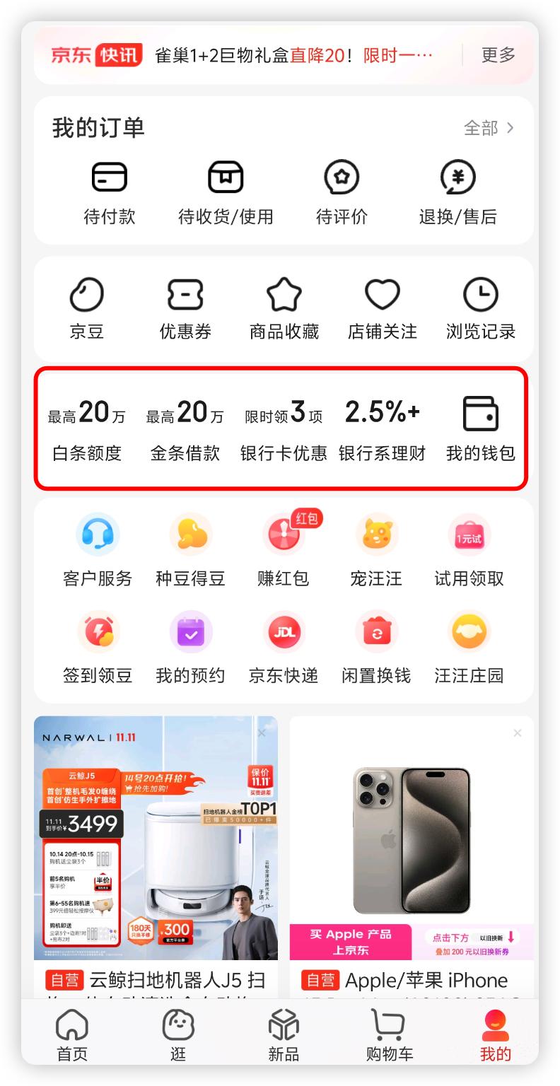 不过,当来到”我的“页面时,这种做法又太成熟了,被”白条最高 20 万“、”金条借款 20 万“、”银行卡优惠“这些字样占据页面接近五分之一面积的设计,仿佛时时刻刻在提醒你快来借钱吧,而鸿蒙版这里仅用”我的钱包“的图标将这些烦人的信息进行了收纳,更加舒服。