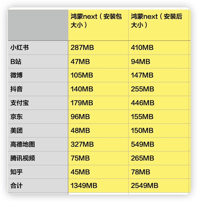 鸿蒙则从 1349MB 变成 2549MB,容量变化非常巧妙地介于安卓和 iOS 之间。解压缩了吗?解了,但对比安卓并不算多,只解了一点点。