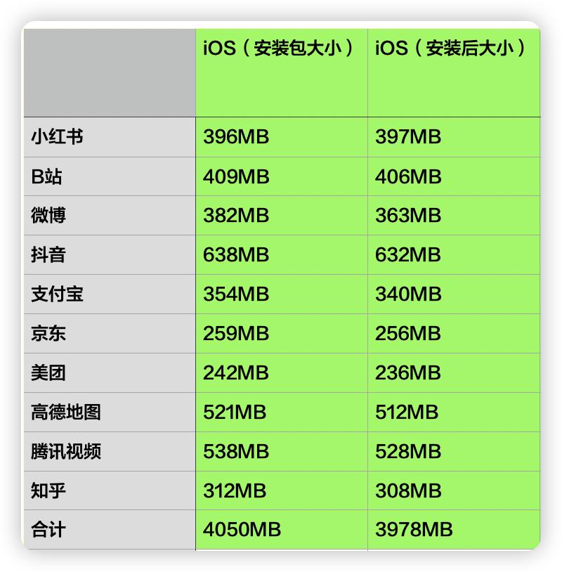 安装包体积悬殊巨大,是因 iOS 的安装机制所导致,可以看到,iOS 上的十款软件安装完成后,合计容量大小和之前几乎一致。换言之,用户下载的应该就是一个完整的软件资源包,几乎不涉及解压缩或者说只进行了极小的解压缩程序。