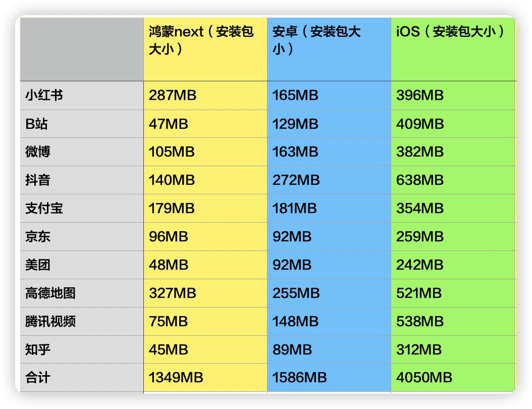 但是,这个特征并非适用所有系统,比如 iOS 的 10 个安装包,无论哪一个,MB 大小都来到三位数,十款软件的安装包容量合计为 4050MB,大约是鸿蒙和安卓的 2.5 ~ 3 倍。