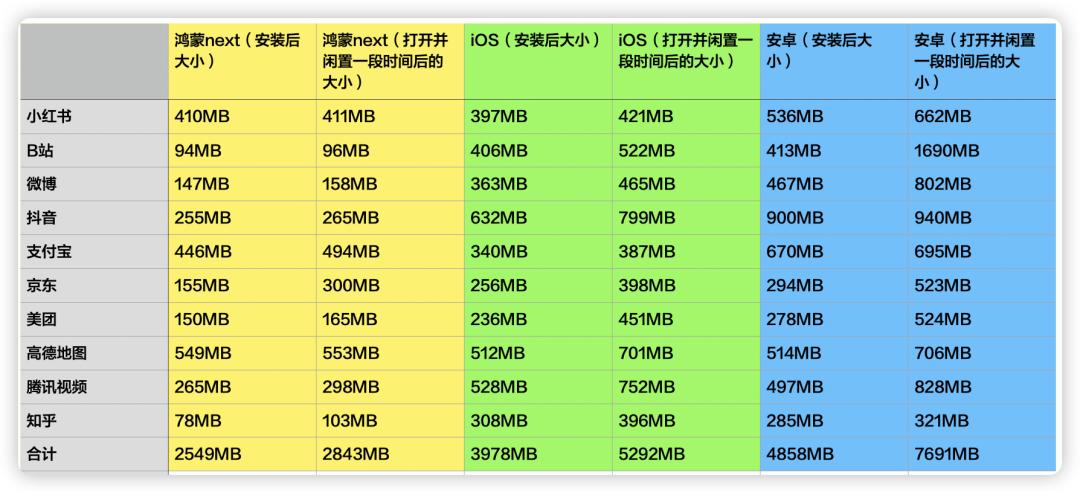 而如果从减少下载时间和节省带宽的角度出发,自然是鸿蒙和安卓这两个解压缩率越高的越好。安卓的合计大小从安装包的 1586MB 变为安装好的 4858MB,屏幕前的“韭菜”都没这么能长。