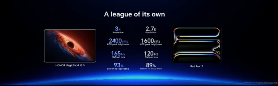 在发布会上,荣耀还在屏幕环节,放了个跟iPad Pro 13对比的PPT。