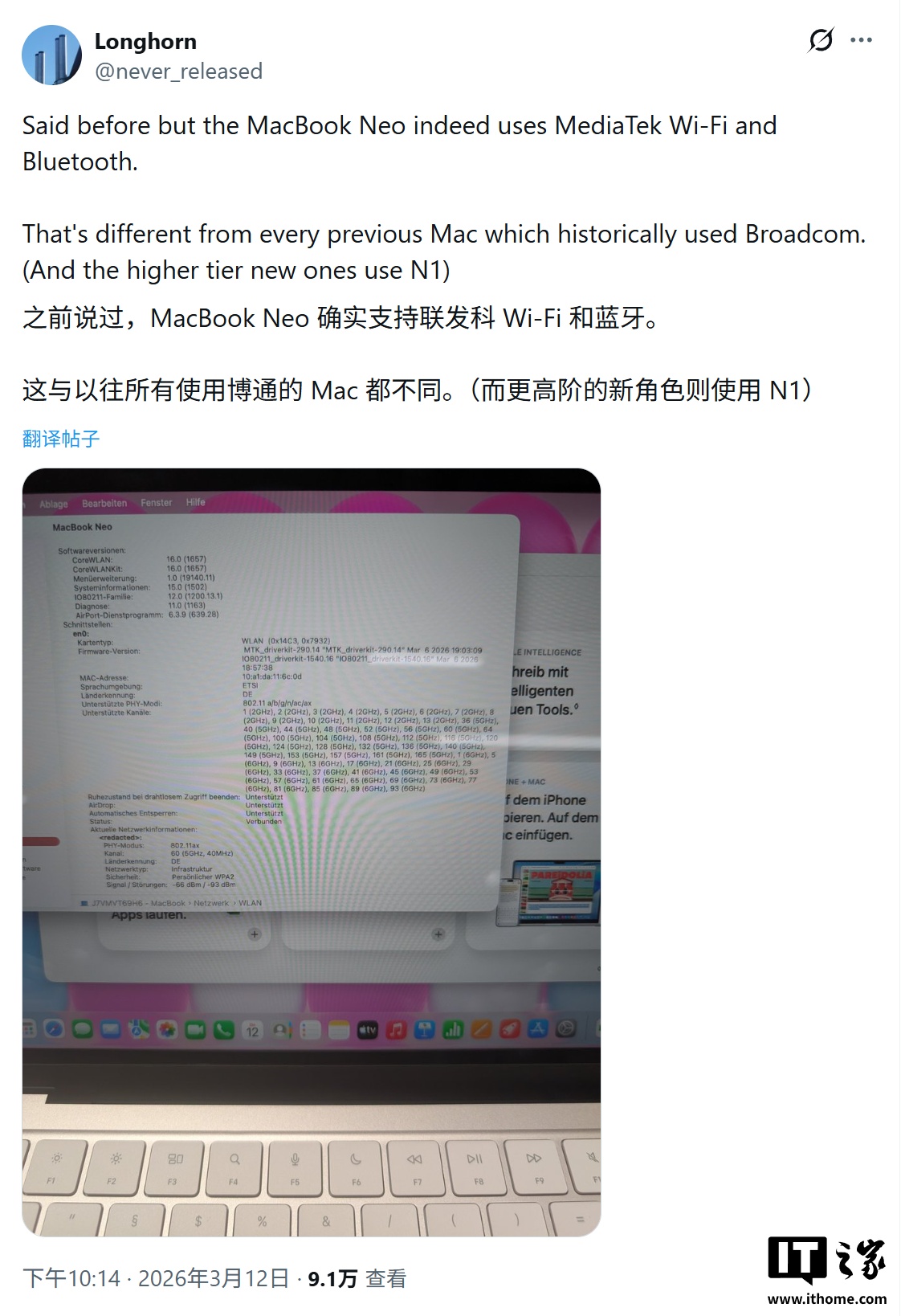 IT之家 3 月 13 日消息,消息源 Longhorn 昨日(3 月 12 日)在 X 平台发布推文,指出在 MacBook Neo 笔记本上,苹果首次在 Mac 产品线中没有使用博通(Broadcom)或苹果自研 N1 芯片,转而采用联发科(MediaTek)的 Wi-Fi 与蓝牙网络芯片。