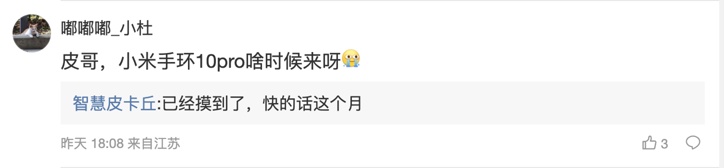 后续有用户在评论区询问:“皮哥,小米手环 10pro 啥时候来呀”,博主回复道:“已经摸到了,快的话这个月”;另一名用户则询问道:“皮皮 X9u 跟 X300u 哪个外放好?”,博主则回复道:“300 的听着不错”。