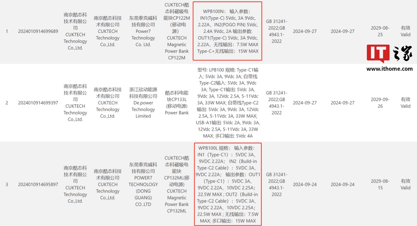 目前,酷态科暂未公布新品的具体规格。IT之家查询到,CUKTECH 酷态科磁吸电能块 CP122M、CP132ML 分别于 9 月 27 日和 9 月 24 日通过国家 3C 认证,均支持 7.5W MAX 无线输出。