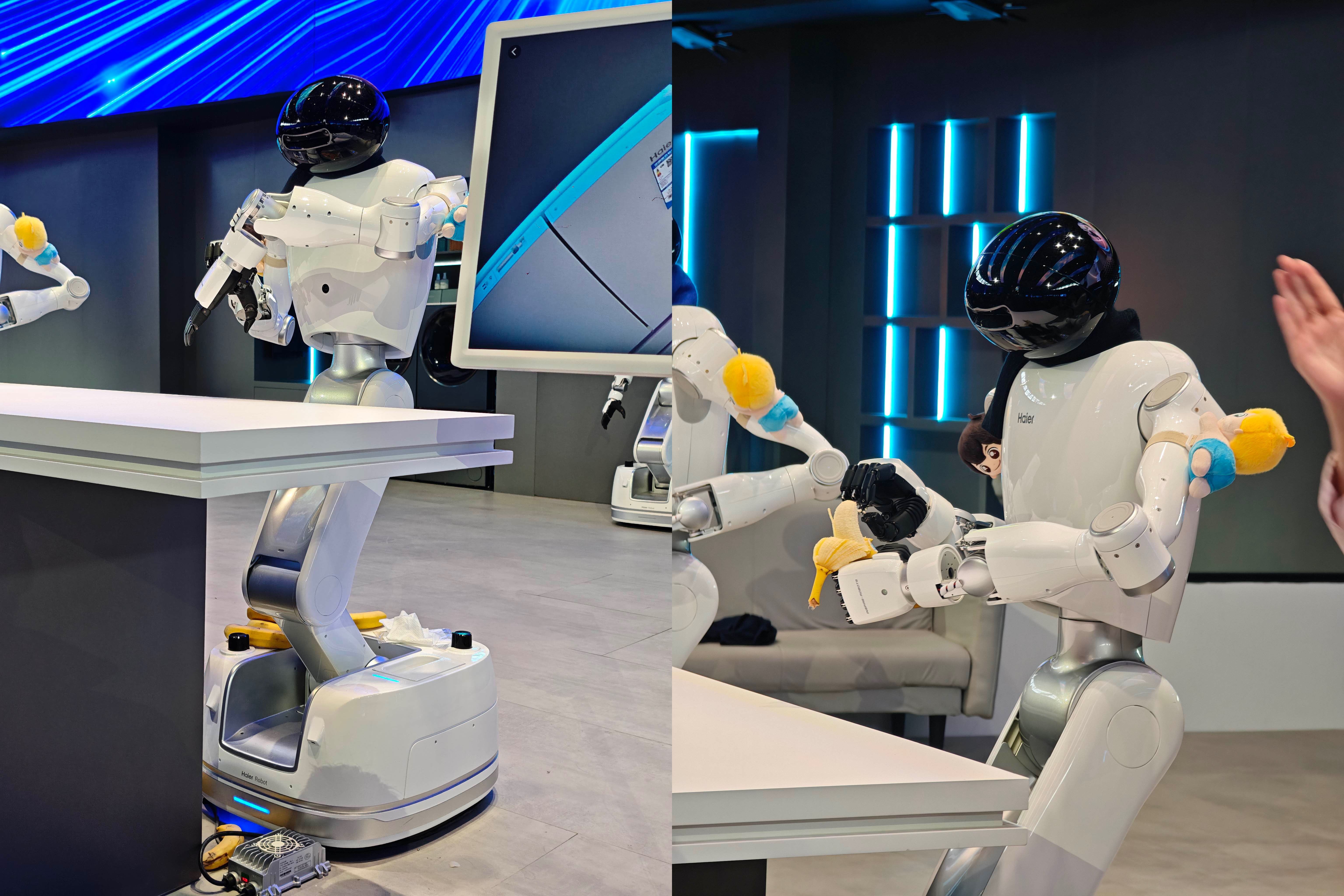 结合AI和机器人技术应用体系,海尔展示了旗下代表未来的「无人家务」生活空间理念;在海信「无家务之家」展厅,一整套家庭机器人体系在工作,包括管家机器人Savvy、陪伴机器人Moii,以及人形机器人Harley。