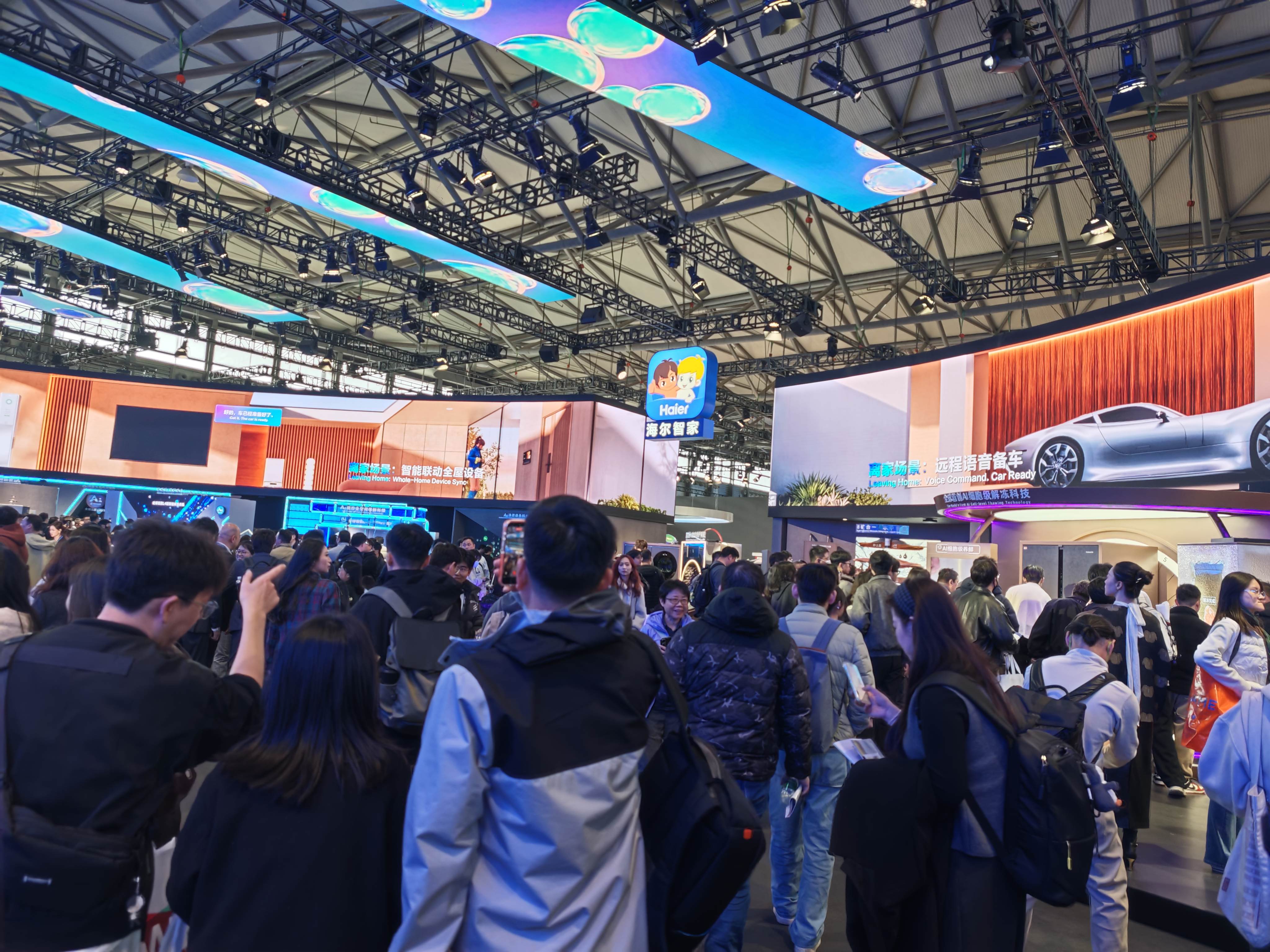与新锐势力互打擂台的是老牌家电巨头代表海尔,其延续了近年包下一个整馆的策略,独占了上海新国际博览中心N5展馆,整个展会期间均是「人山人海」。
