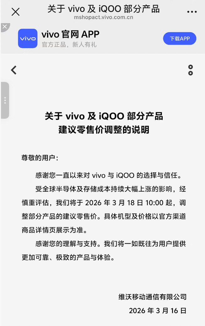 对此,vivo方面回应称:“近期上游存储等核心器件供货与成本波动较大,行业普遍面临阶段性压力。在此背景下,我们会根据阶段性价格政策对部分在售机型/版本的建议零售价进行调整,相关信息将以官方渠道公示为准。”