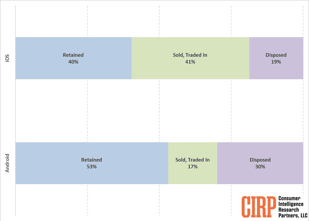 IT之家 10 月 10 日消息,市场调查机构 CIRP 昨日(10 月 9 日)发布博文,报道称美国智能手机用户群体中,有 41% 的 iPhone 用户选择当作二手出售,或者以旧换新,而在安卓群体中该比例仅有 17%。