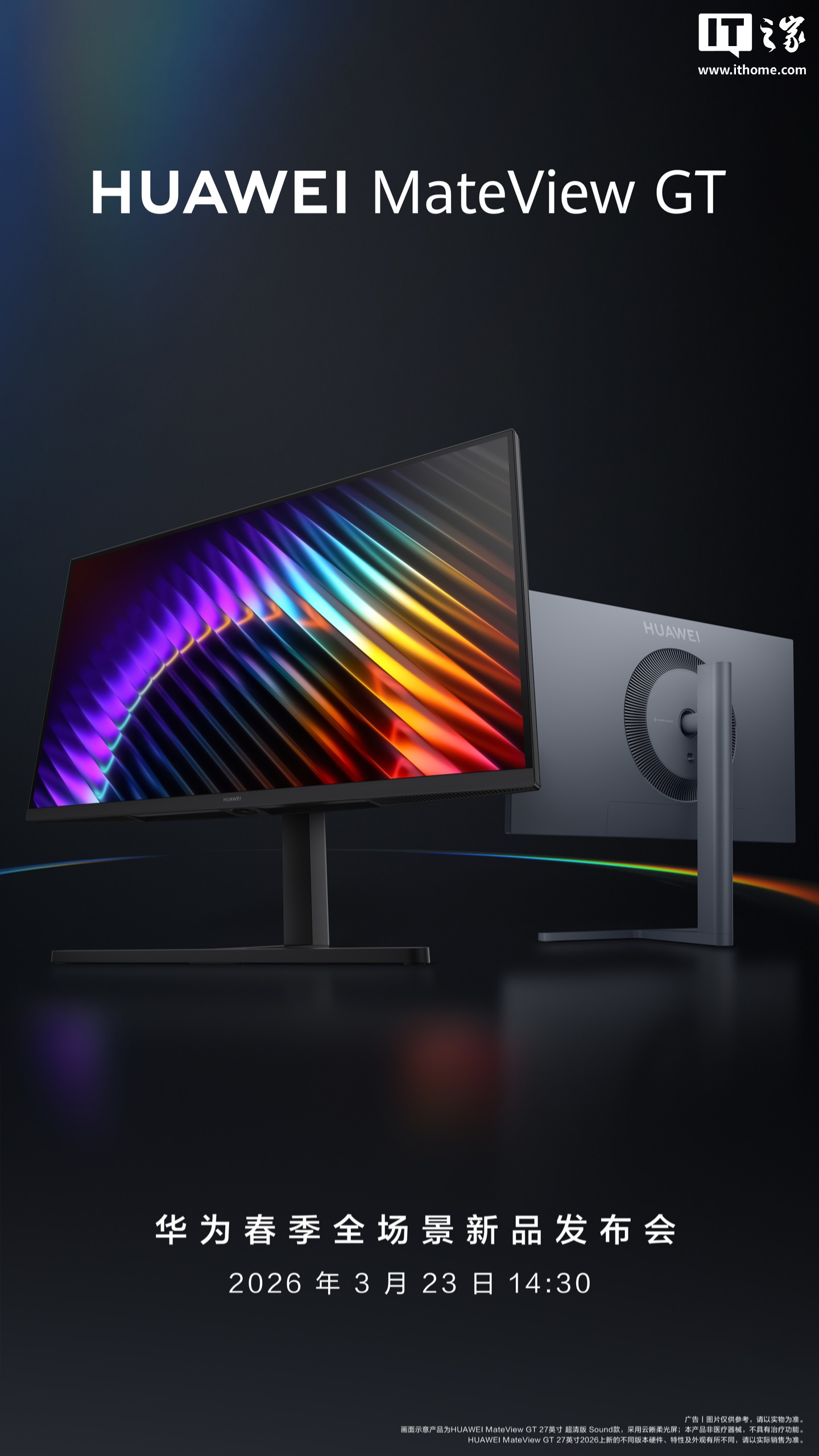 IT之家 3 月 17 日消息,华为春季全场景新品发布会定档 3 月 23 日,官方今日宣布将推一款华为 MateView GT 27 英寸显示器。